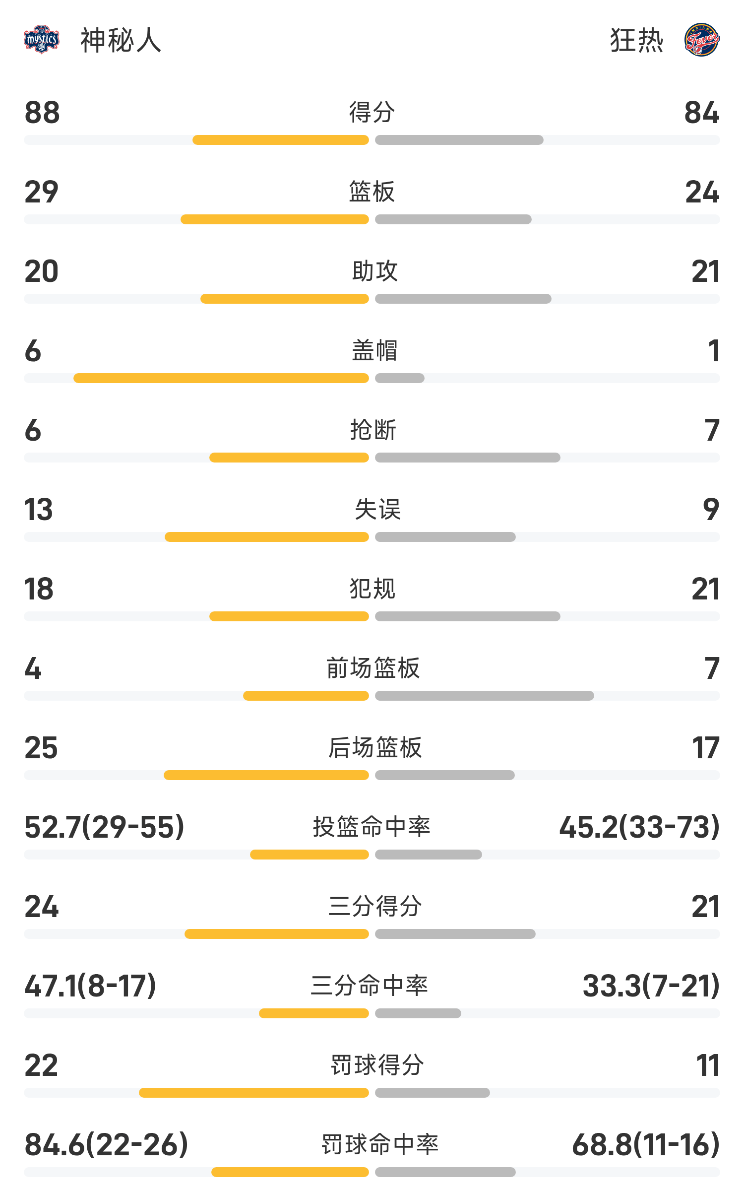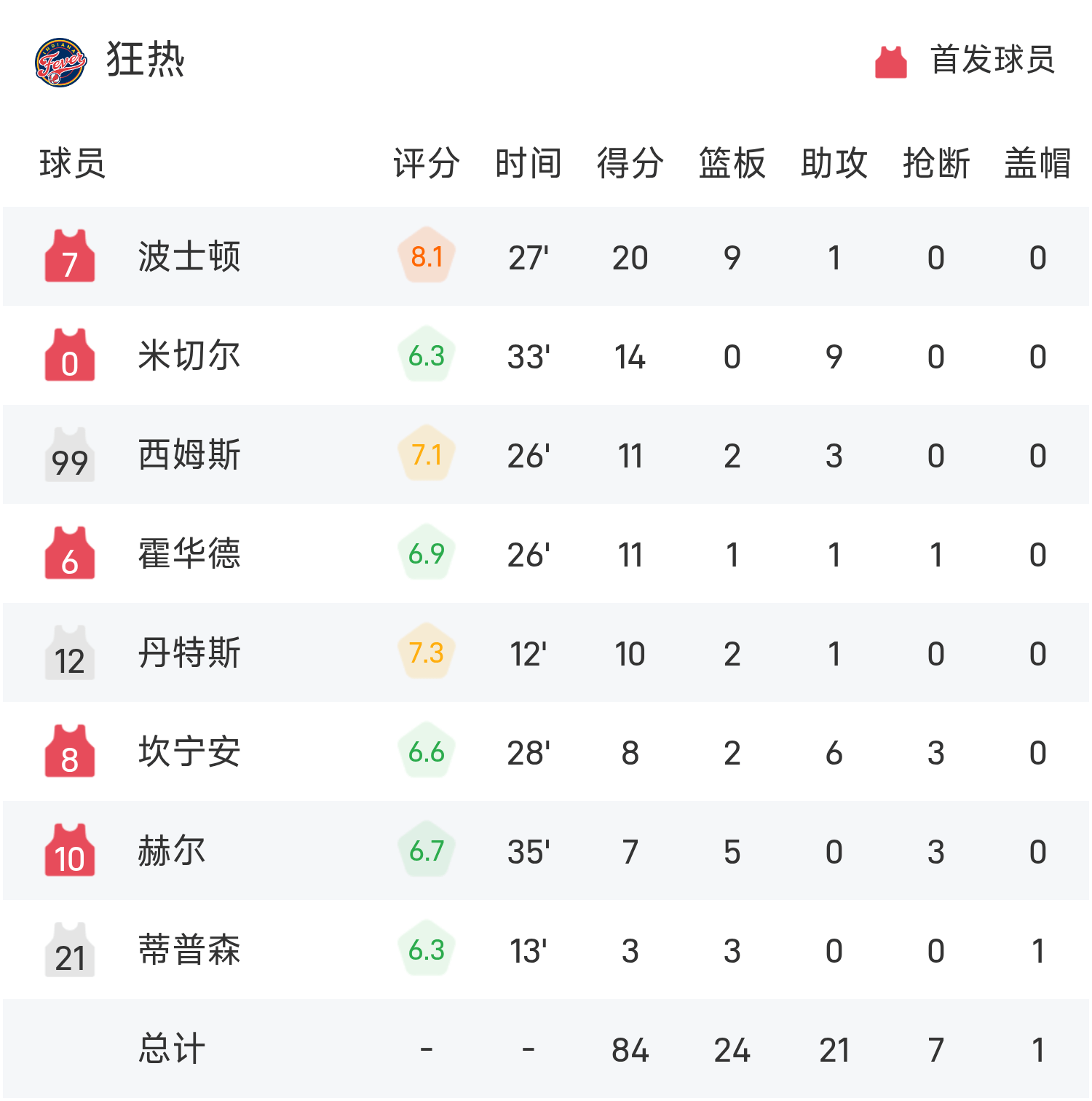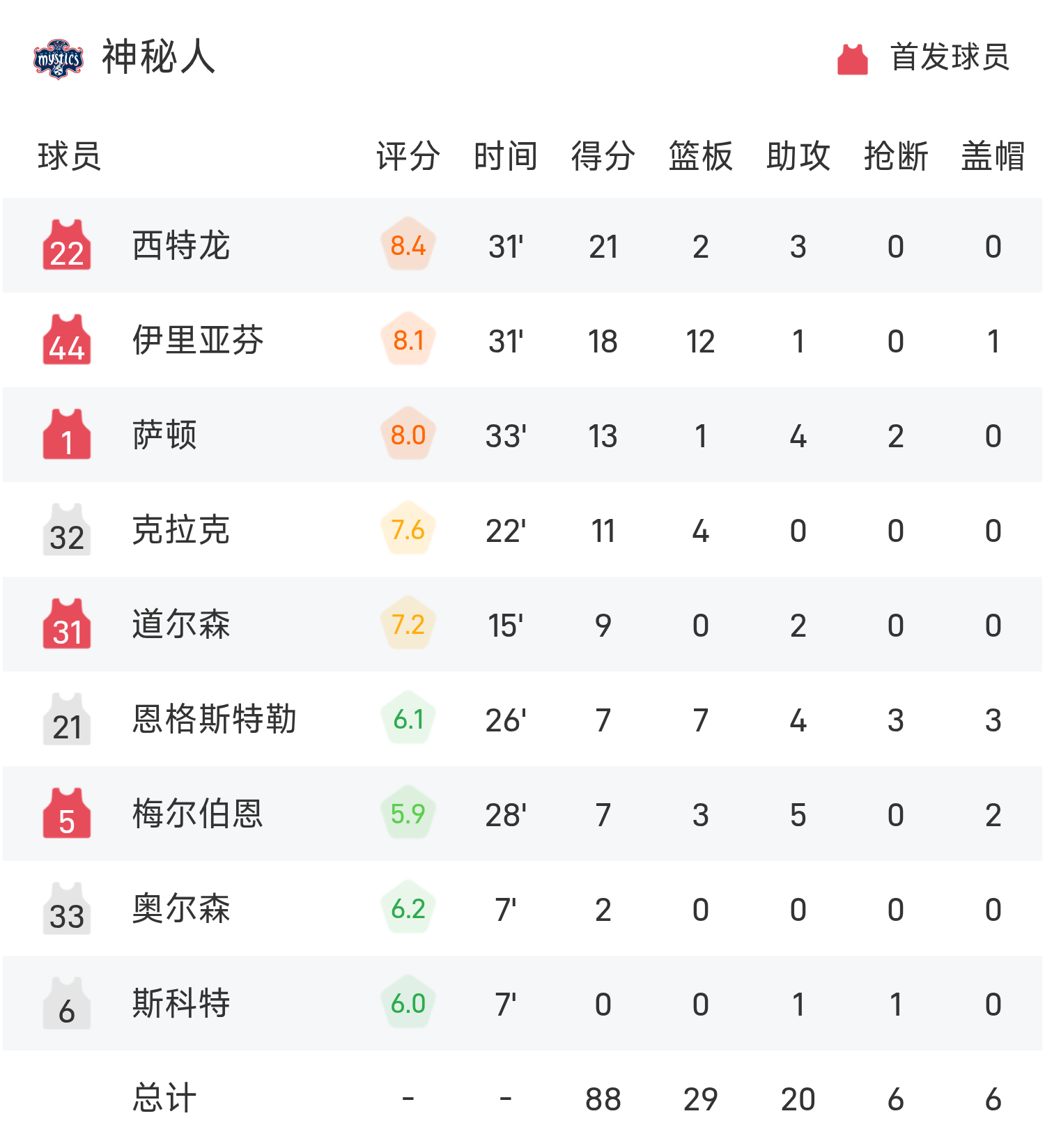 文章目录 [+] 08月16日讯 25赛季WNBA 常规赛,狂热对阵神秘人。双方全场战罢,狂热84-88不敌神秘人。西特龙砍下全场最高的21分2板3助,率领神秘人成功取胜。球员数据 查看更多详细数据 查看更多